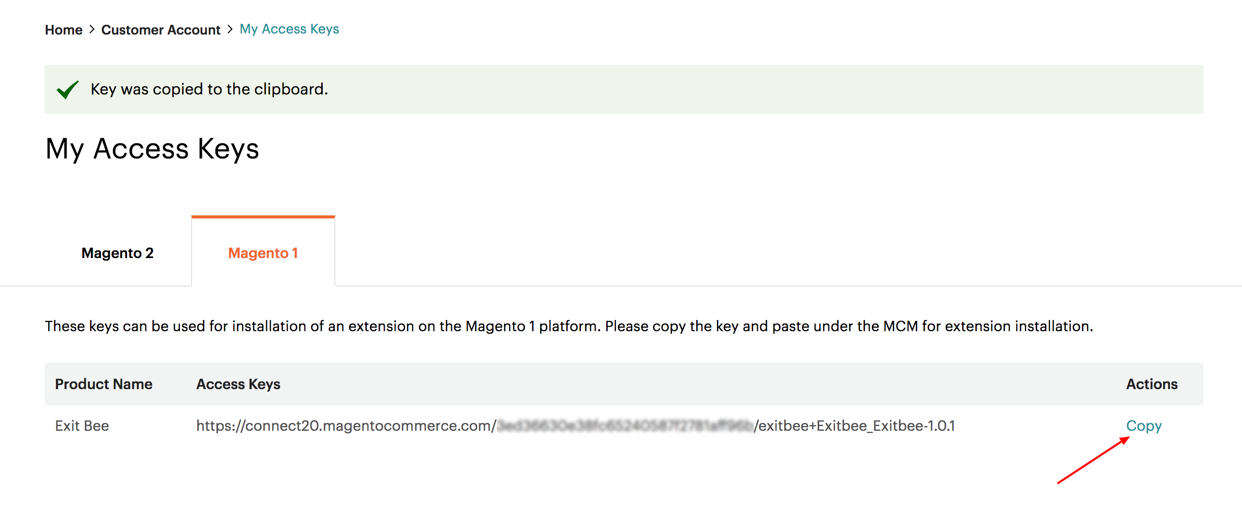 3. Copy the Exit Bee extension access key from your acount Access Keys page in Magento Marketplace as displayed below