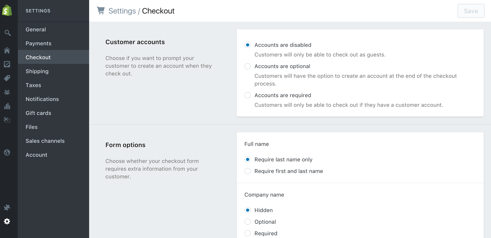 1. Login to your Shopify store as an administrator. Click ‘Settings’ on the left column menu and then click on the ‘Checkout’ link on the ‘Settings’ sub-menu.