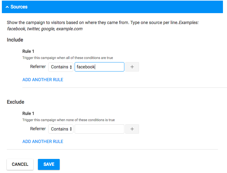 Using the Sources targeting setting you're able to filter the visitors who will see the campaign, based on the traffic source. You can have a campaign that will be shown only to visitors who come from Facebook and another one for those who come from Google .